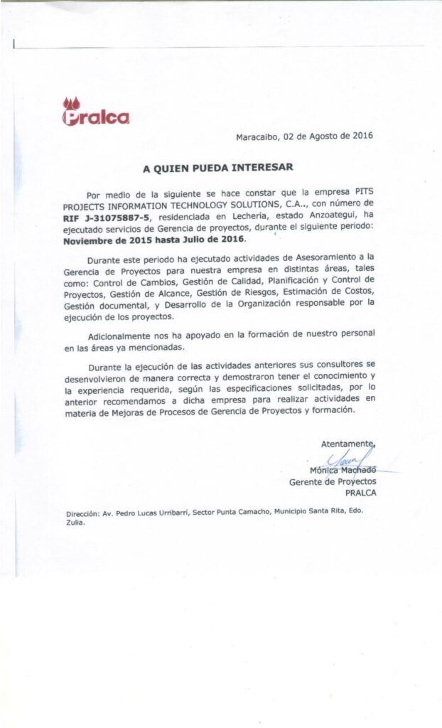 Ha ejecutado actividades de Asesoramiento a la Gerencia de Proyectos para nuestra empresa en distintas áreas, tales como: Control de Cambios, Gestión de Alcance, Gestión de Riesgos, Estimación de Costos, Gestión documental y Desarrollo de la organización responsable por la ejecución de los proyectos…